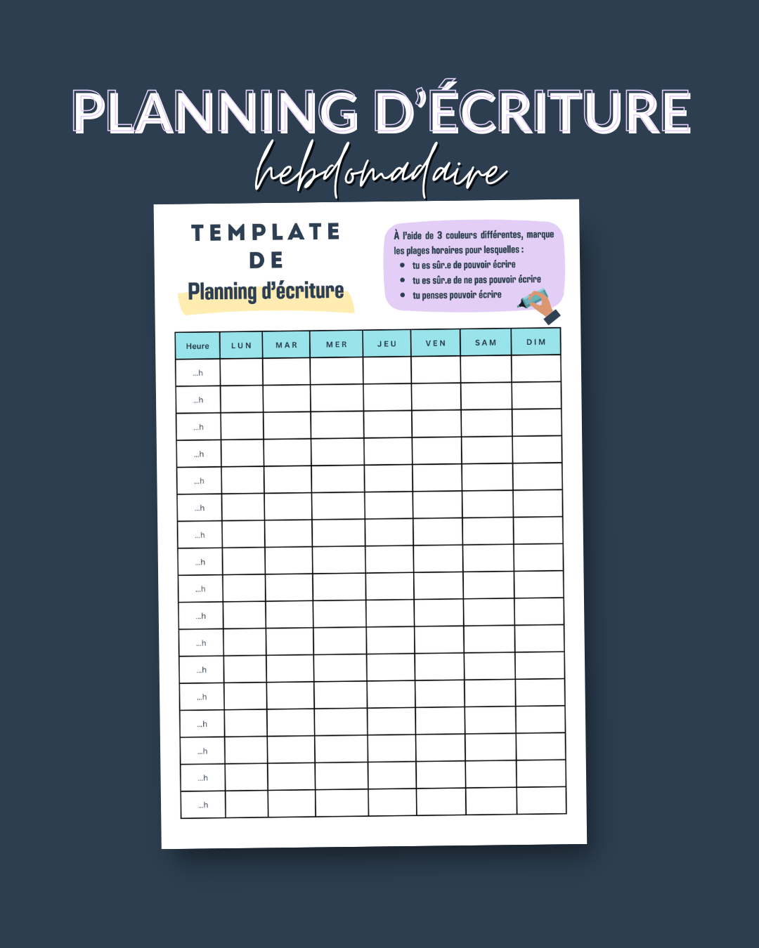 Ce planning hebdomadaire est conçu pour tâaider Ă intĂ©grer lâĂ©criture dans ta routine de maniĂšre rĂ©aliste et efficace. Que tu sois au dĂ©but de ton projet ou en plein cĆur de lâĂ©criture, ce planning te permettra de rester concentré·e, motivé·e et rĂ©gulier·e dans tes sessions dâĂ©criture.