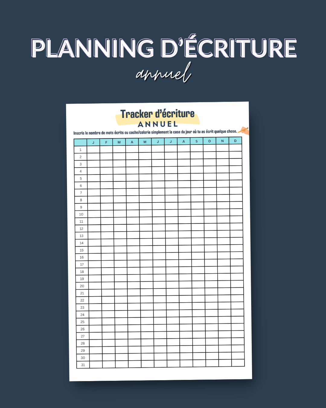 Visualise tes progrĂšs dâĂ©criture sur lâannĂ©e en un coup dâĆil ! Ce planning gratuit te permet de colorier chaque jour ou dây inscrire ton nombre de mots, pour suivre tes avancĂ©es avec motivation et constance.