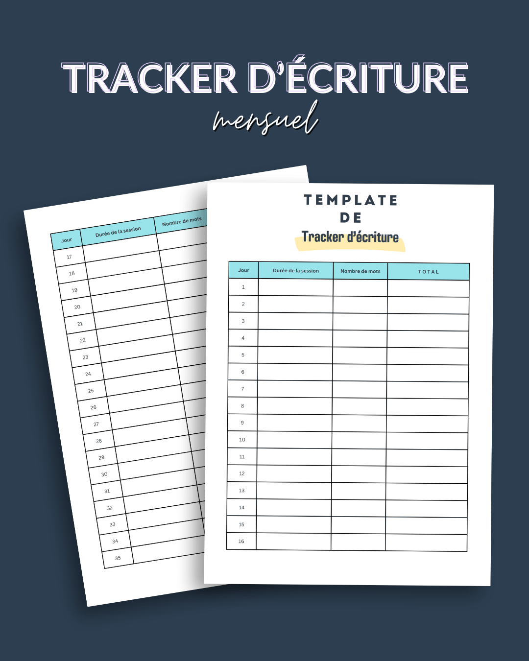 Optimise ton écriture avec ce tracker mensuel gratuit ! Note la durée de chaque session et le nombre de mots écrits pour visualiser tes progrÚs, ajuster ton rythme, et rester motivé·e tout au long du mois.