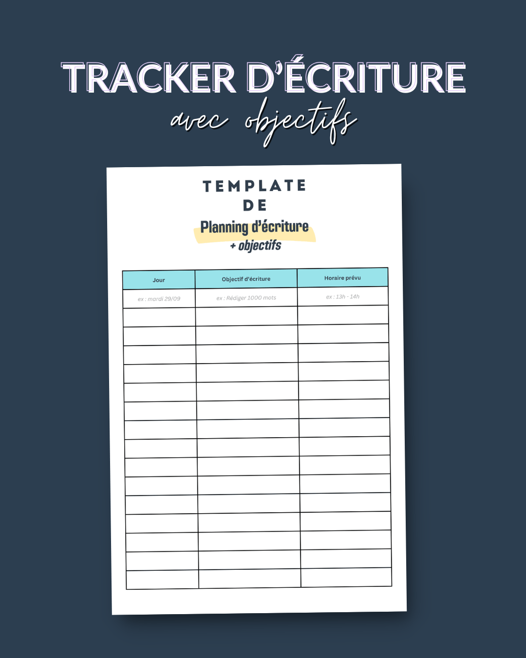 Organise tes sessions dâĂ©criture avec ce planning gratuit ! Fixe-toi des objectifs clairs pour chaque journĂ©e et rĂ©serve des crĂ©neaux prĂ©cis pour avancer efficacement dans ton projet. Avec ce template, reste motivé·e, garde une vision dâensemble sur tes progrĂšs, et atteins tes objectifs pas Ă pas.